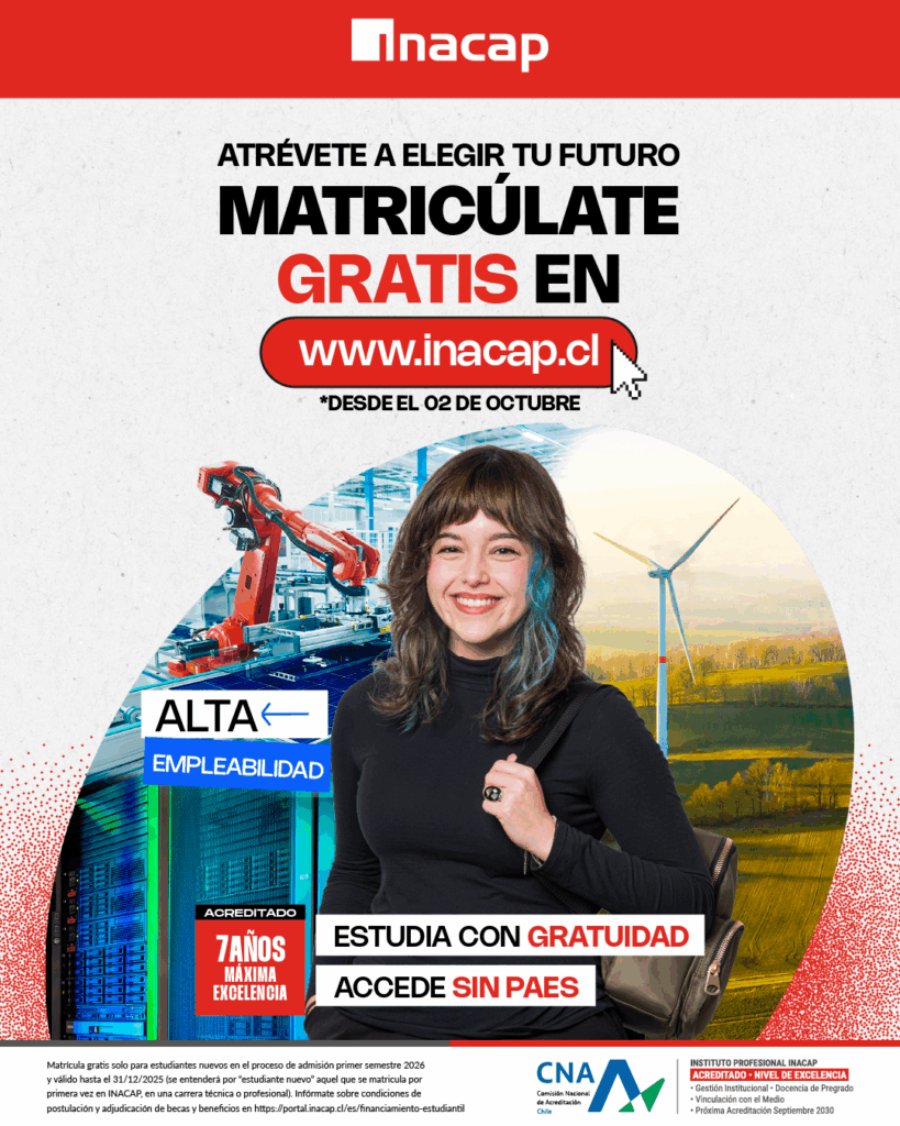 este proceso, ya contamos con una matrícula cercana al 30%. Por la experiencia de años anteriores, en diciembre ya quedan muy pocas vacantes, por eso hacemos un llamado a matricularse pronto” y agregó “INACAP Sede Rancagua recibe estudiantes de todas las comunas de la Región de O’Higgins, lo que demuestra la confianza de las familias en nuestro Proyecto Educativo”.